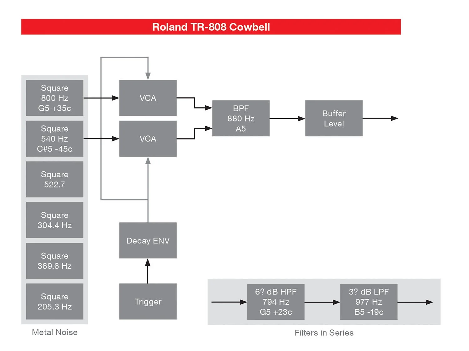 The cowbell on the CR-5000 and 8000 use a different sound source, but are otherwise the same as on the 808. The CR-5000/8000 creates two square wave oscillators out of NAND gates. The oscillators are tuned to 800 Hz (G5 +35 cents), and 555 Hz (C#5 +2 cents).