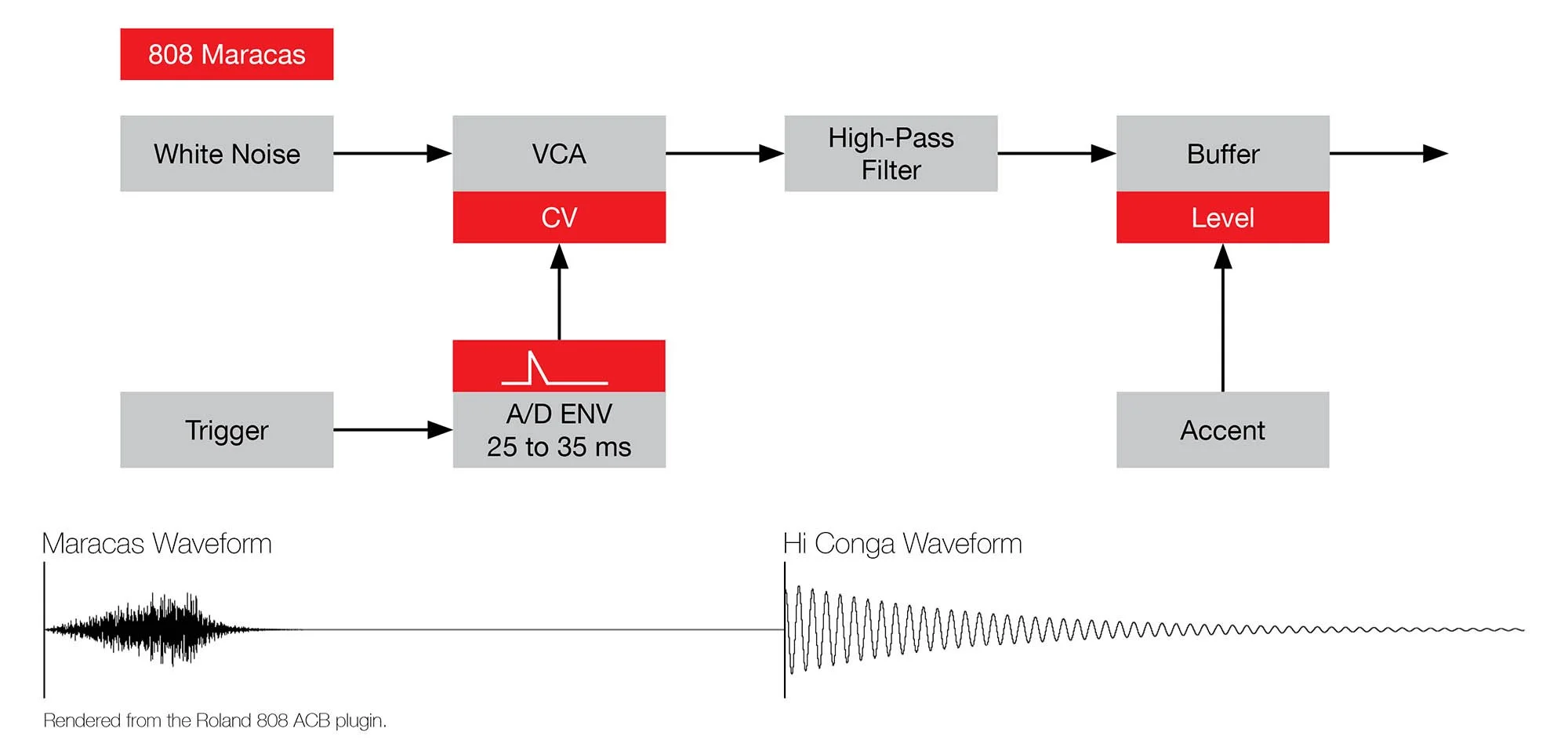 Pass the white noise through a VCA, then modulated it with a short envelope. Unlike other 808 sounds the Maracas has an AR envelope rather than a decay only envelope.
